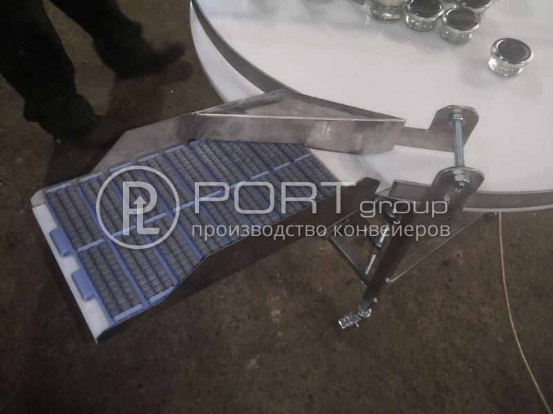 Приемный стол ныне успешно работает в линии с подающим столом и принимает баночки после аппликатора. Баночки спускаются на стол по роликовому спуску, позволяющему менять угол наклона. Материал столешницы - полипропилен толщиной 20 мм.
