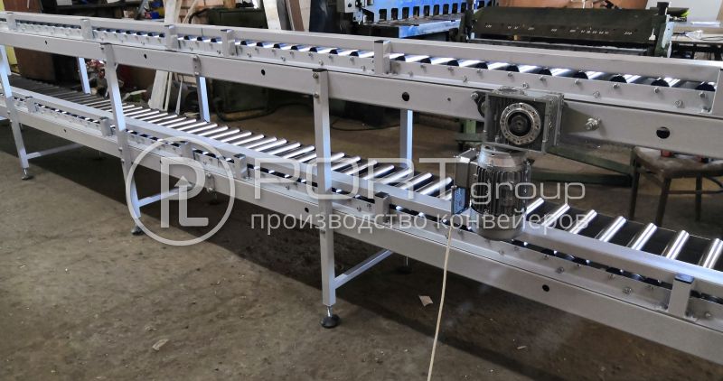 Длина конвейера 12 метров, снизу закрыт защитным кожухом, приводной ремень производства Habasit, материал роликов - нерж. сталь марки Aisi 304. Просмотр видеоматериала здесь: